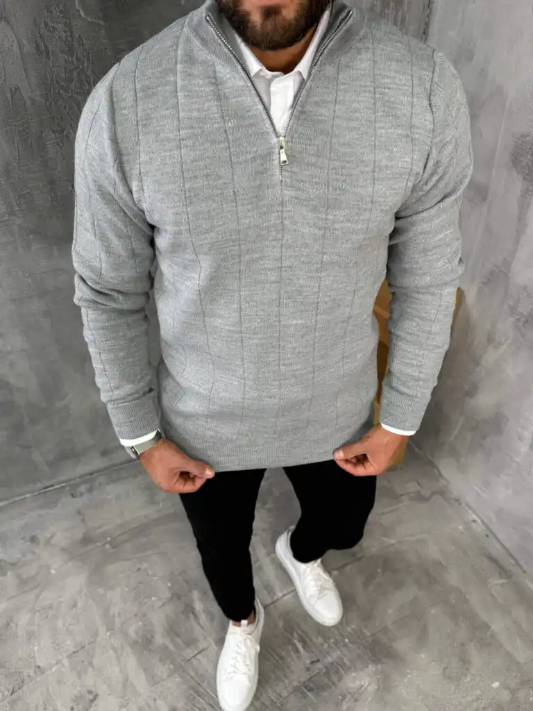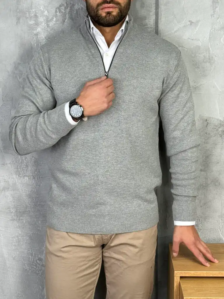 Muški elegantni tamnosivi džemper sa rajsferšlusom, prednji prikaz. Tamnosiva