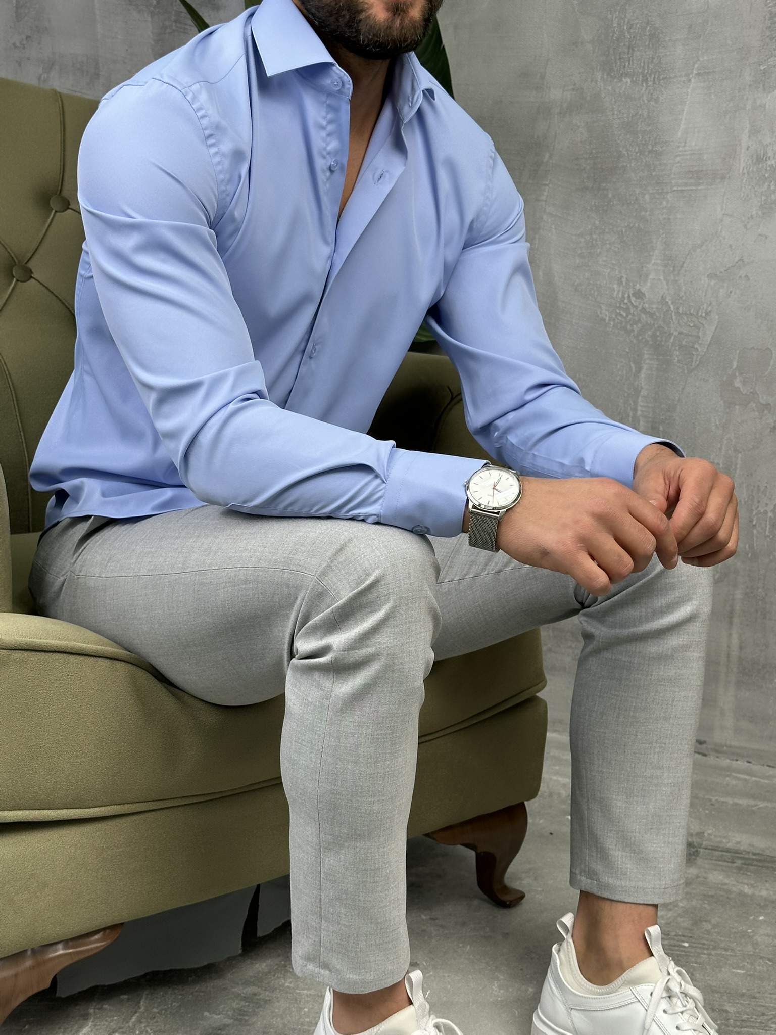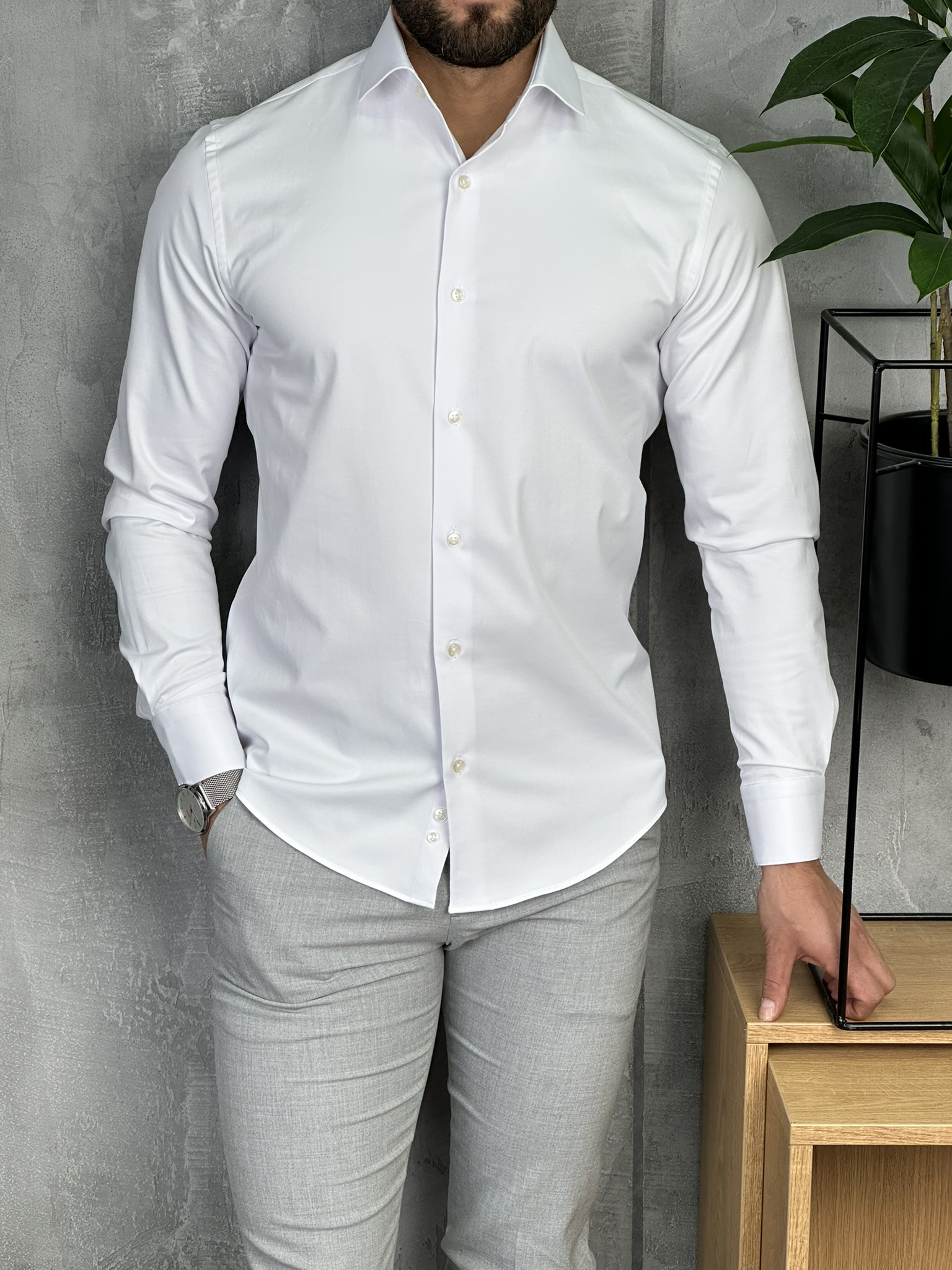 Klasična košulja modernog kroja, izrađena od visokokvalitetnog pamuka sa dodatkom elastina koji obezbeđuje savršeno prijanjanje i slobodu pokreta. Materijal je gladak, prijatan na dodir i otporan na gužvanje, što je čini idealnim izborom za posao, svečane prilike ili svakodnevno nošenje.