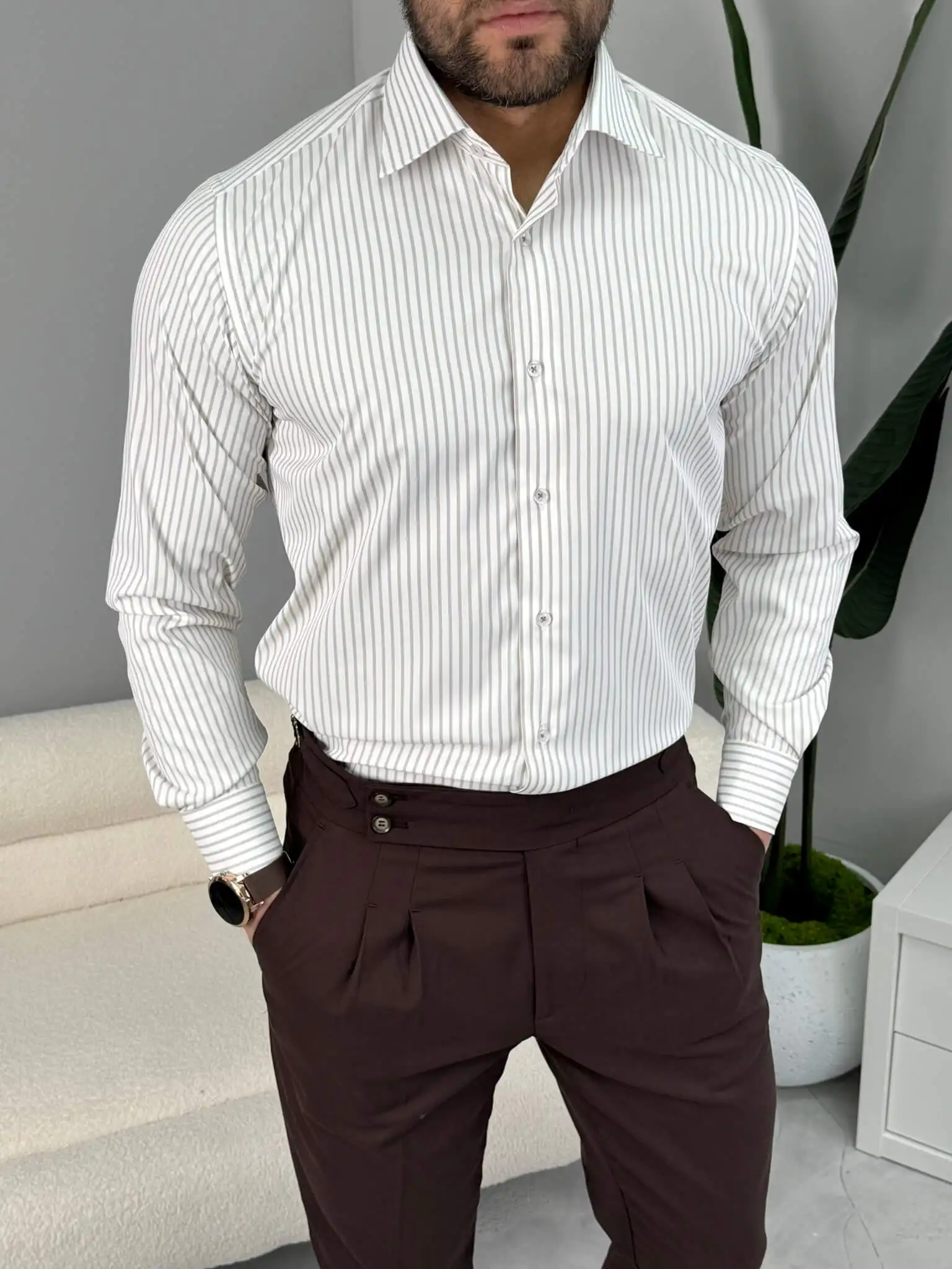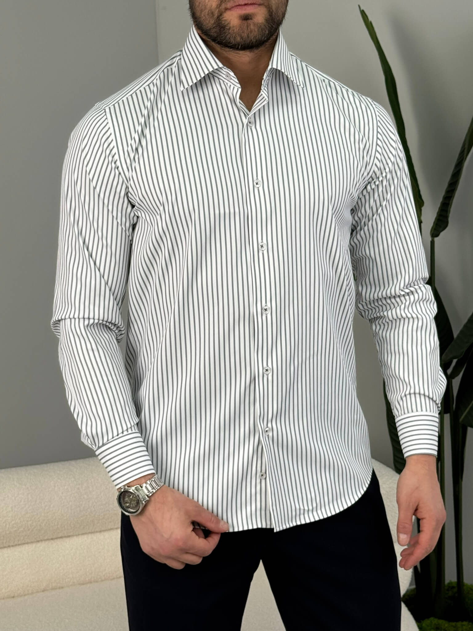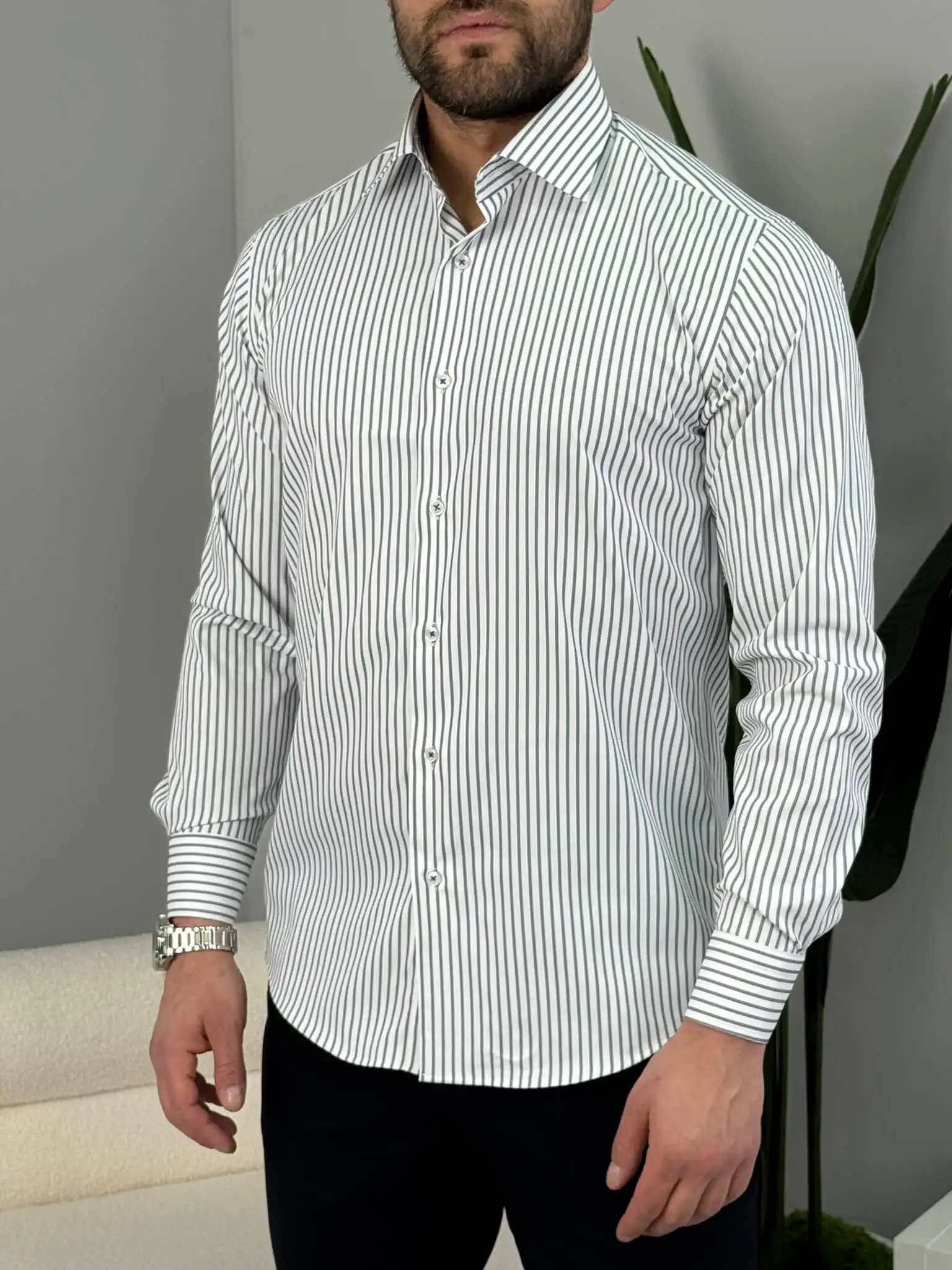 Ako tražiš mušku prugastu košulju koja ostavlja uredan i samouveren utisak, ovaj slim fit model je pravi izbor. Izraženije pruge vizuelno izdužuju figuru i daju moderniji, elegantan izgled, dok kroj prati liniju tela bez stezanja. Lako je kombinuješ uz teget, crne ili braon pantalone – idealna je za posao, sastanke i sve prilike gde želiš da izgledaš sređeno bez preterivanja.