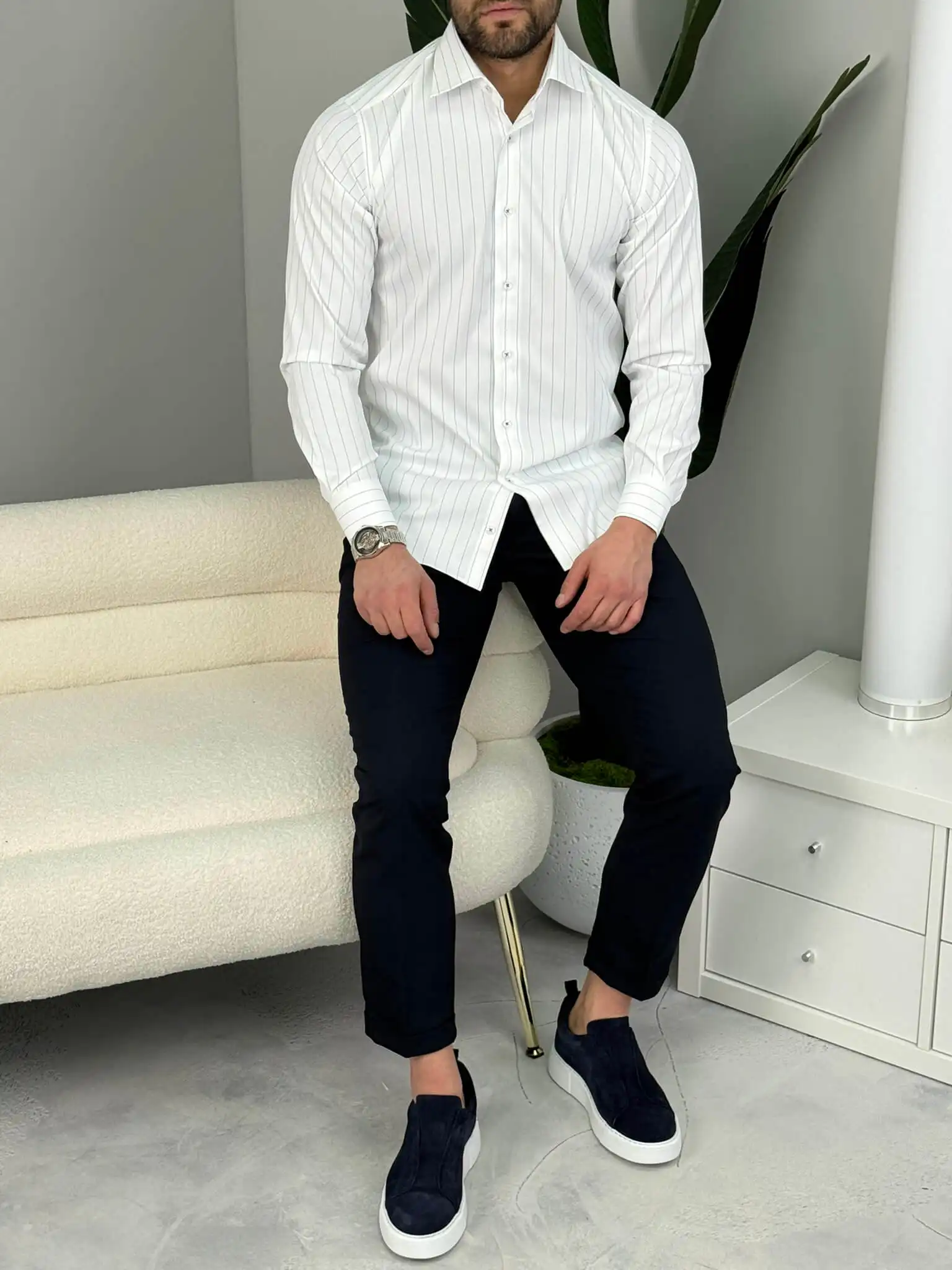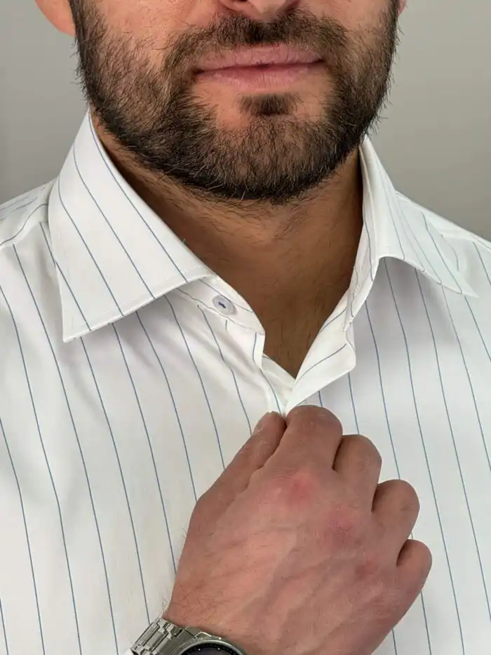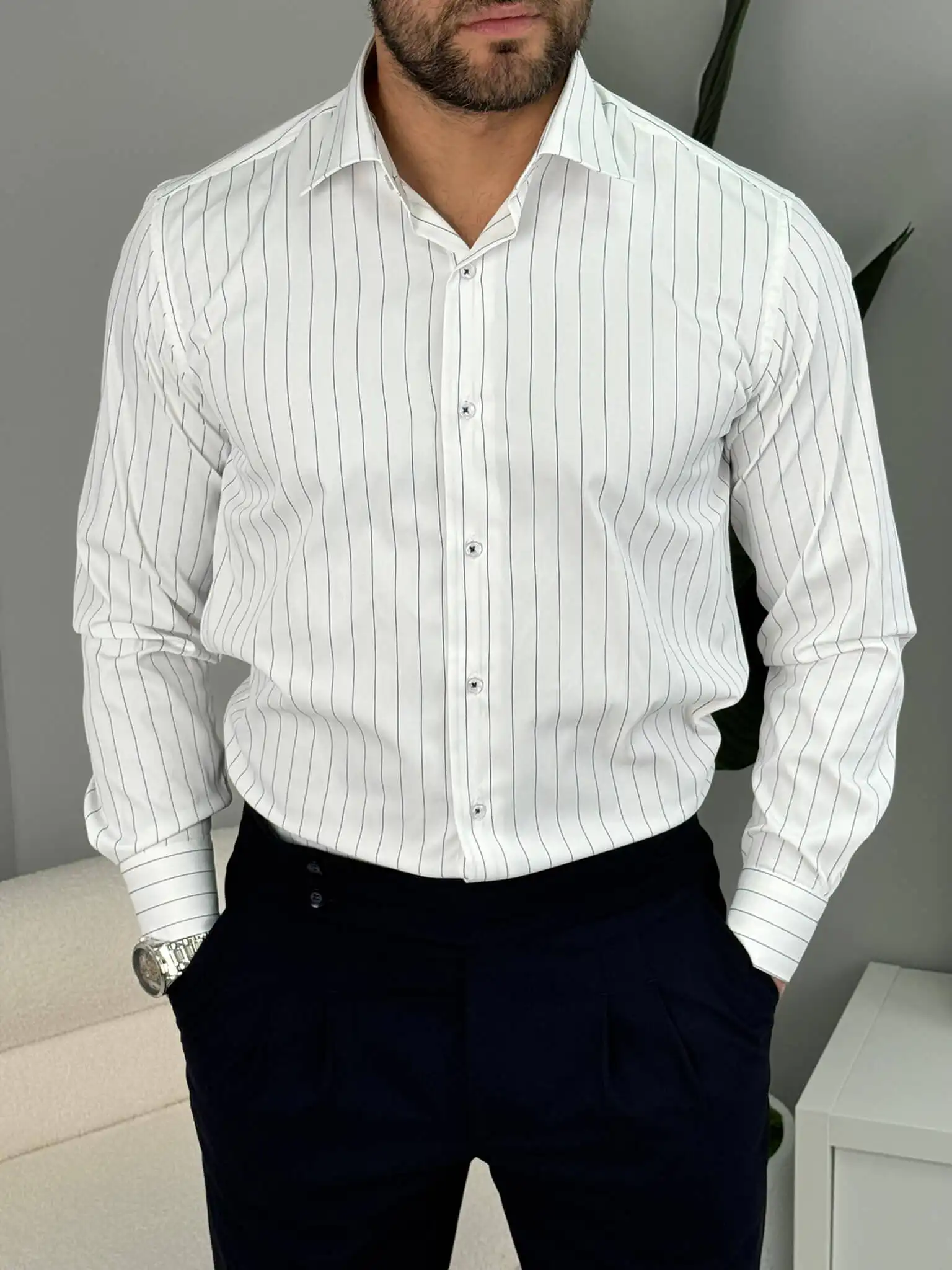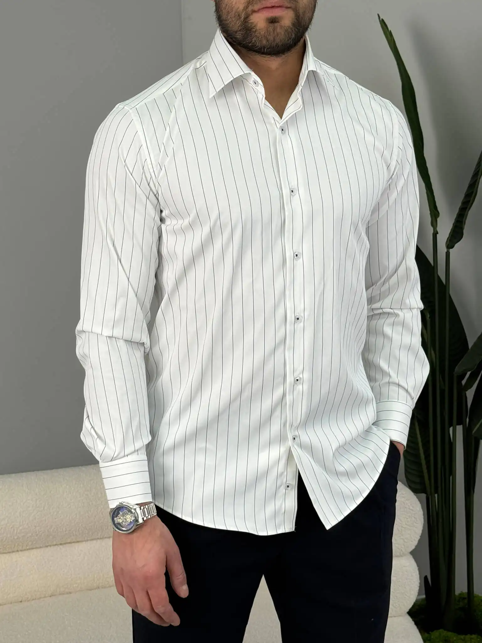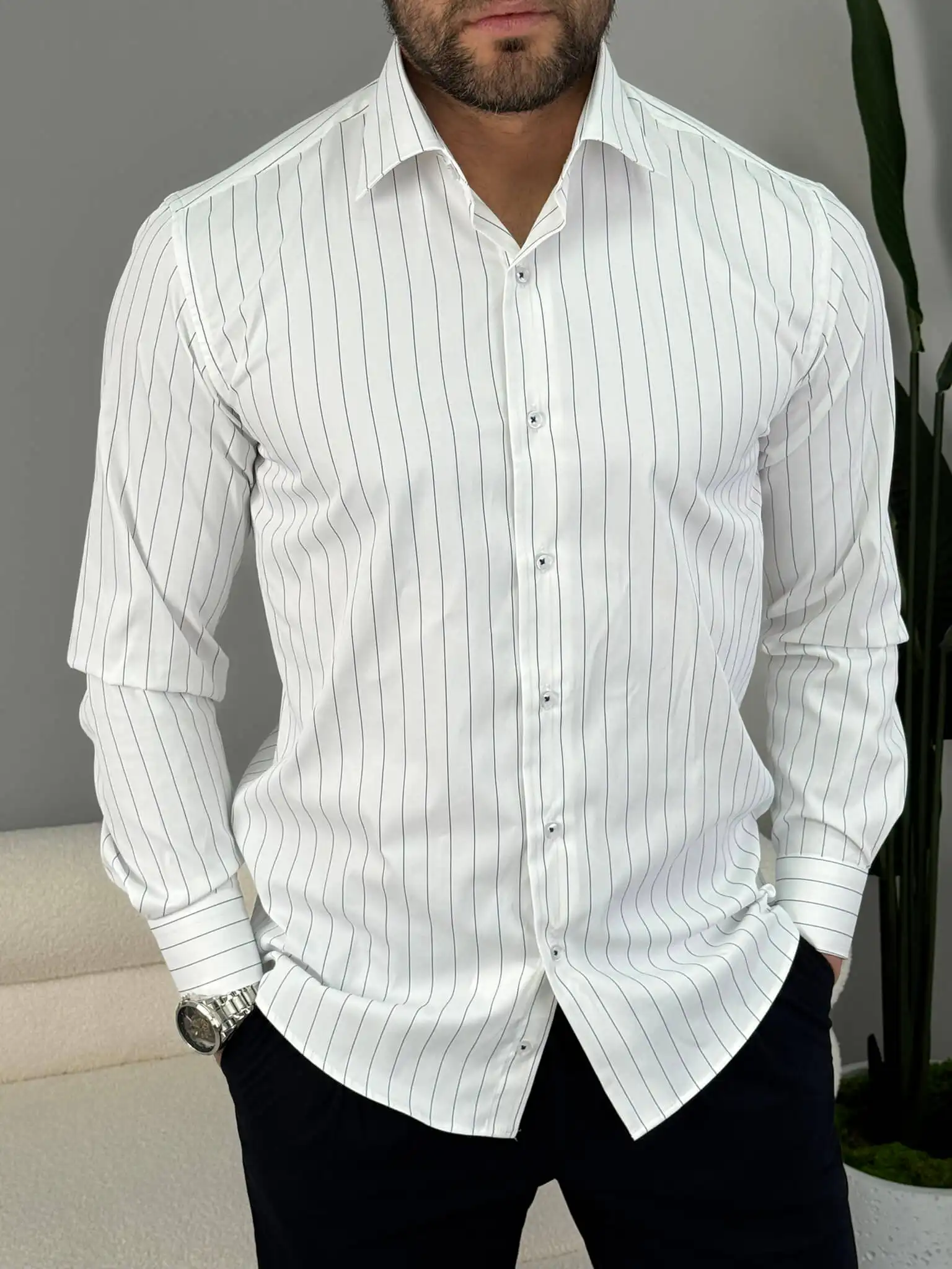 Ako tražiš mušku prugastu košulju koja daje uredan i moderan izgled bez preterivanja, ovaj slim fit model je siguran izbor. Tanje pruge vizuelno izdužuju figuru, a kroj prati liniju tela i lako se kombinuje uz odelo ili elegantne pantalone.