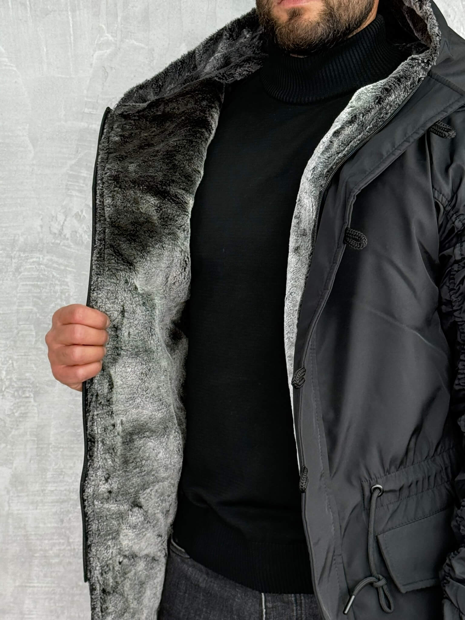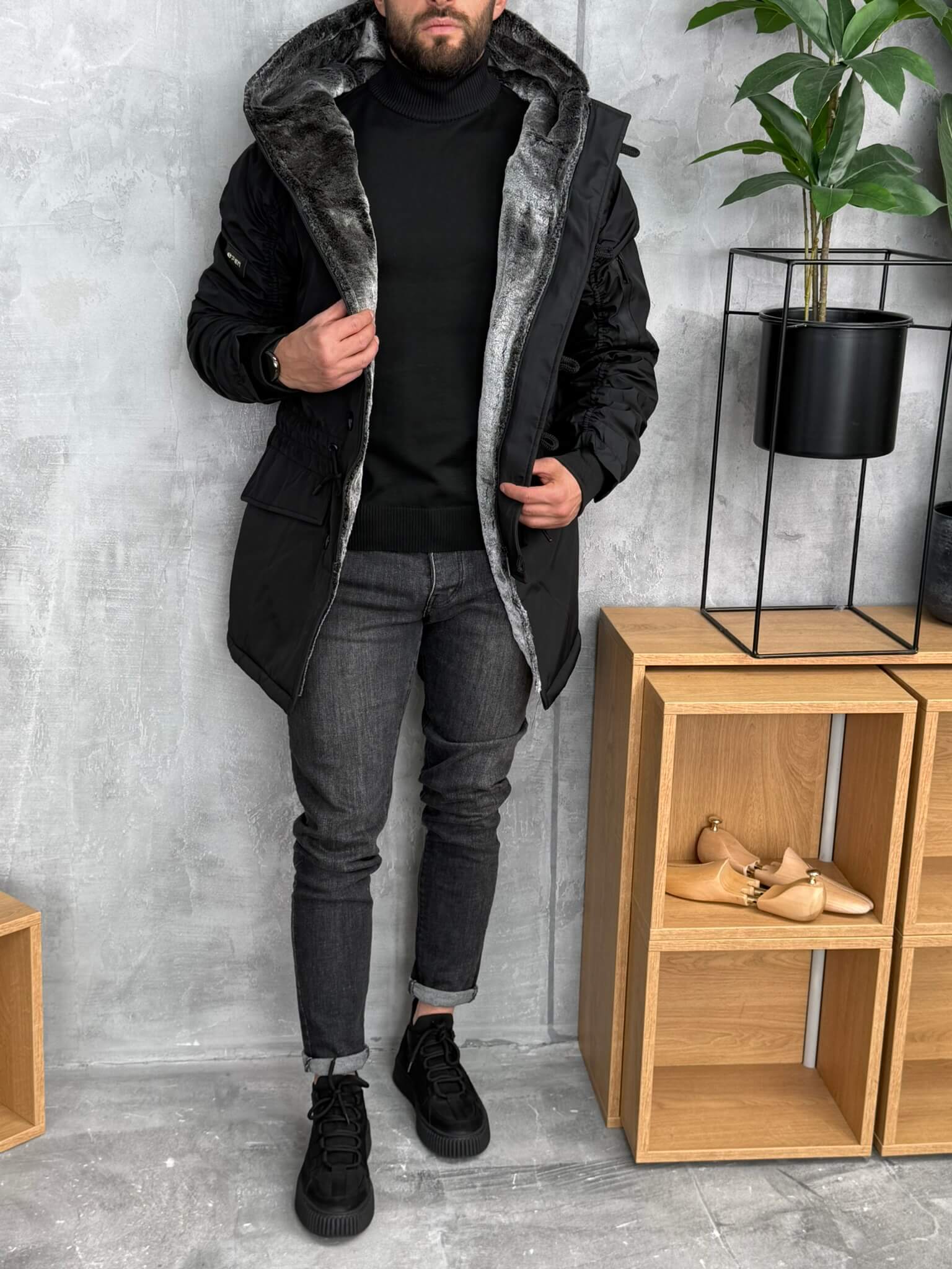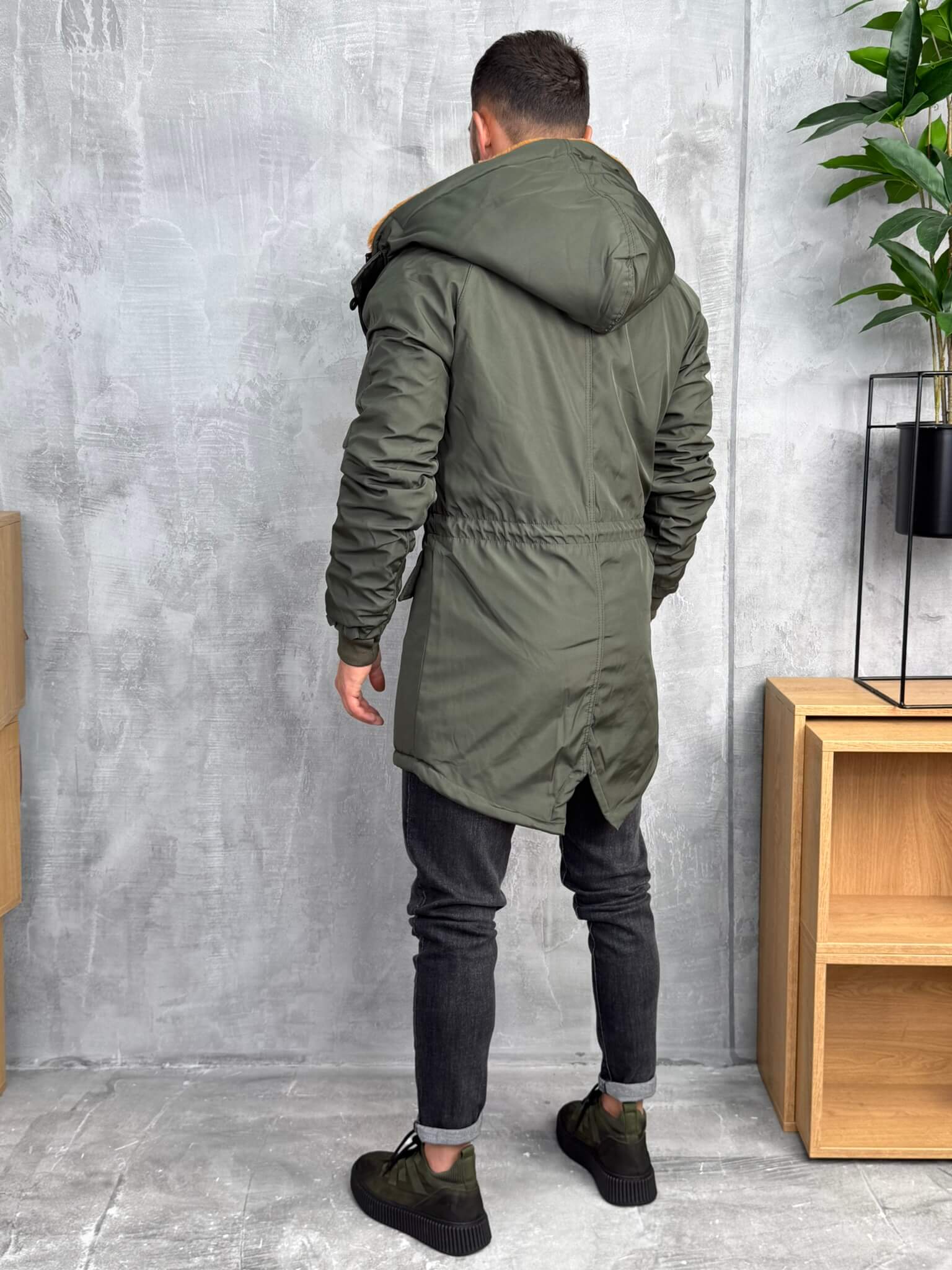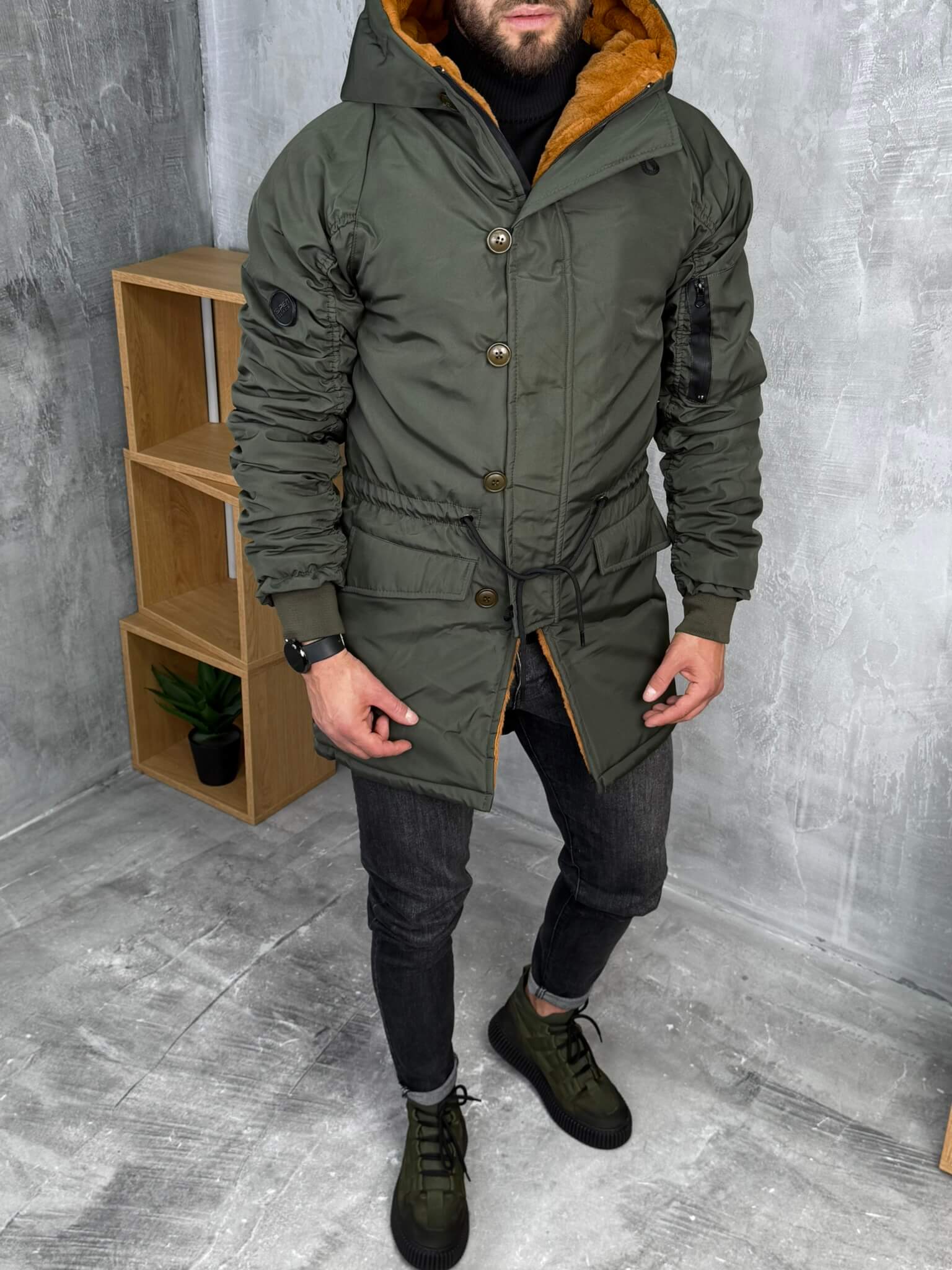 Muška zimska jakna dostupna u maslinastozelenoj boji sa toplom narandžastom postavom od krzna i u crnoj boji sa sivim krznom. Dizajnirana je da pruži maksimalnu udobnost, toplotu i zaštitu tokom hladnih zimskih dana.