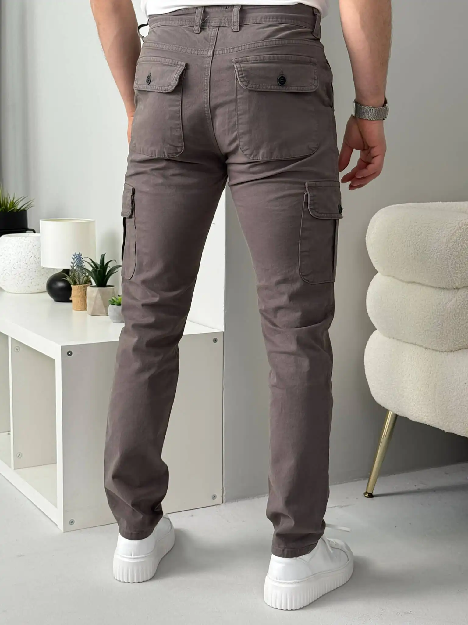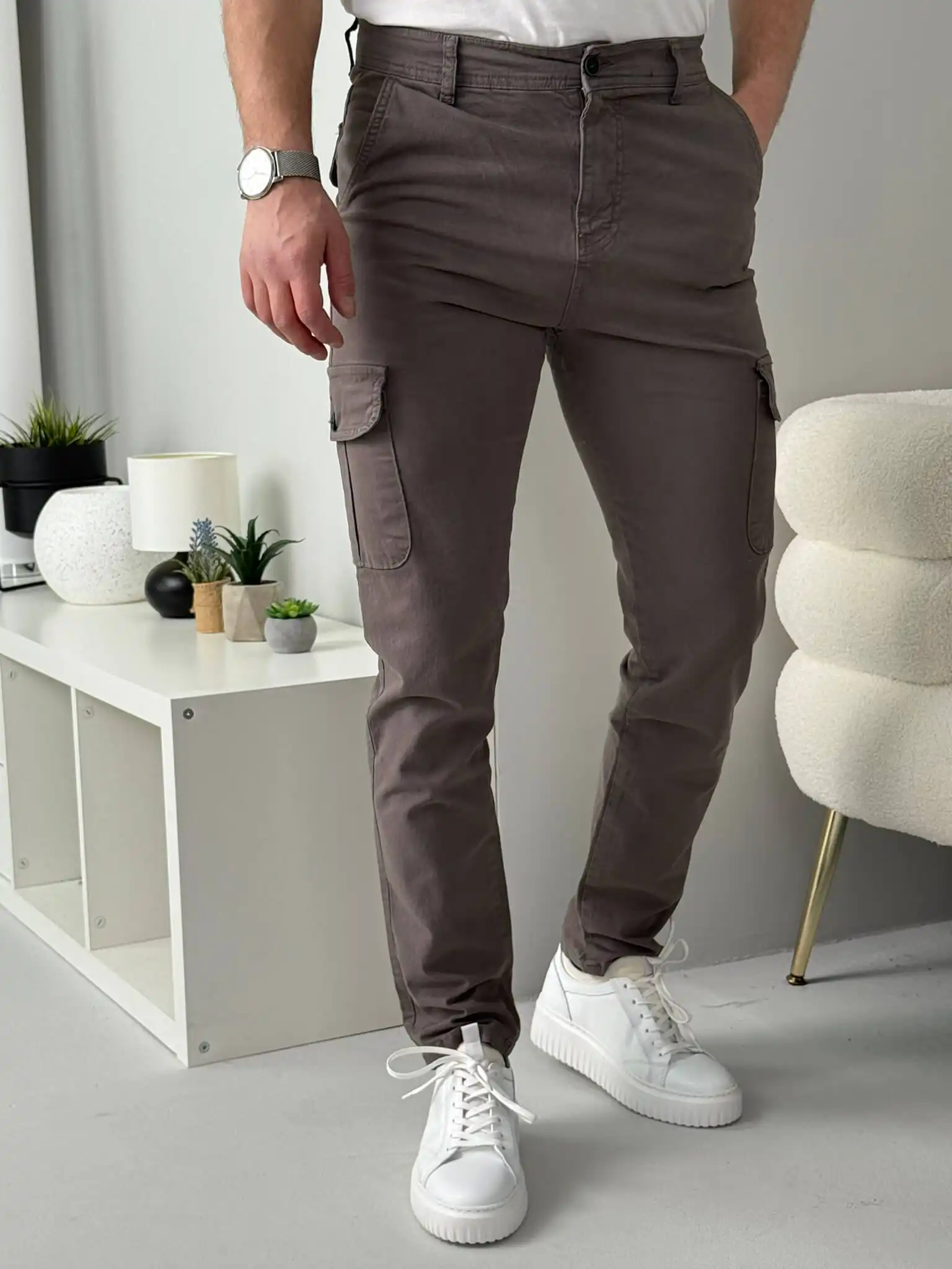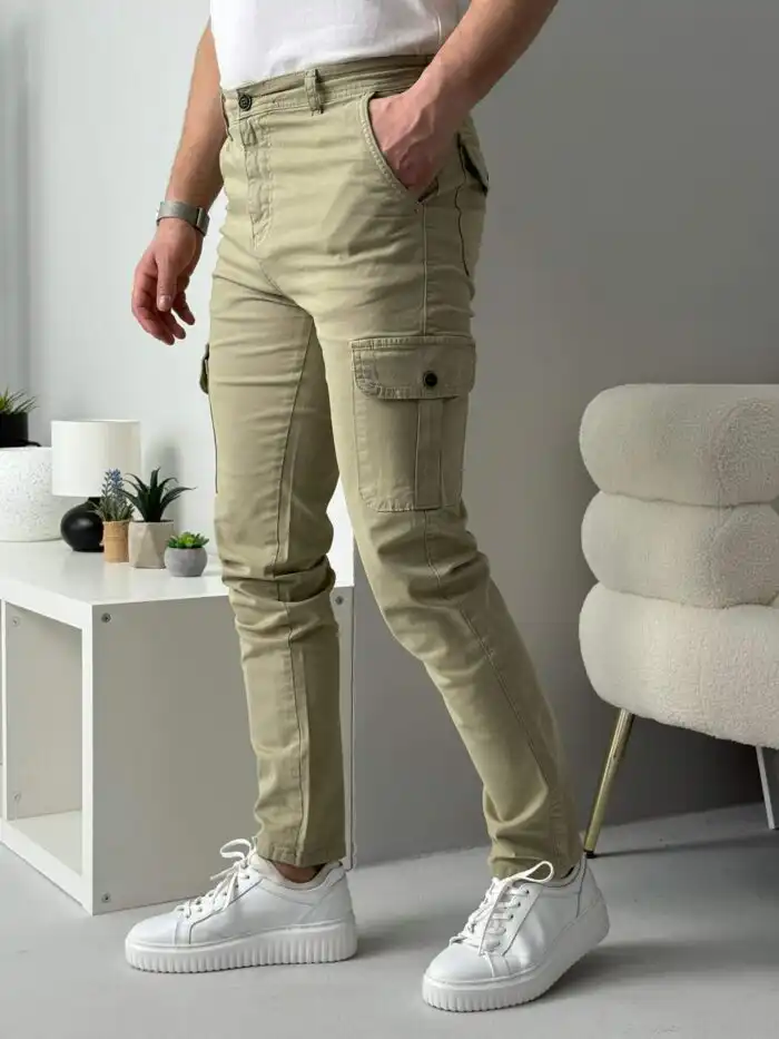 Izrađene od kvalitetnog kepera, ove muške kargo pantalone pružaju idealan balans između modernog dizajna i funkcionalnosti. Klasičan slim fit kroj naglašava siluetu, dok bočni džepovi sa preklopom dodaju prepoznatljiv vojni izgled. Dostupne su u četiri univerzalne boje – bež, crnoj, maslinastoj i sivoj, savršene za casual i urban stil.