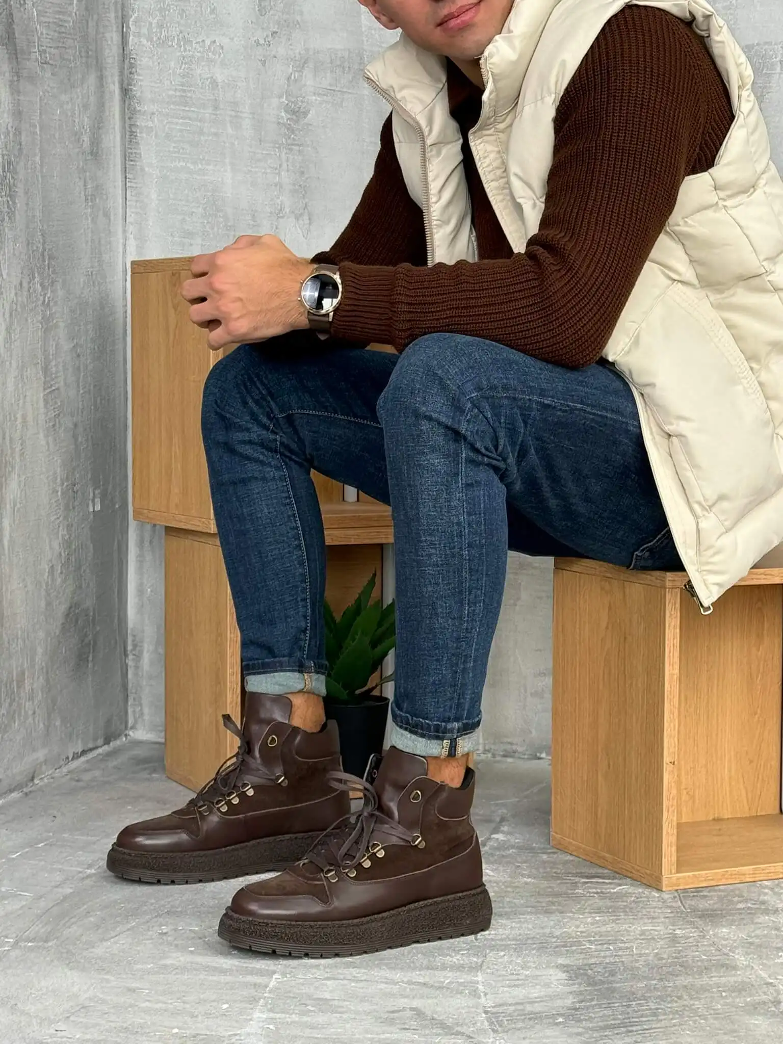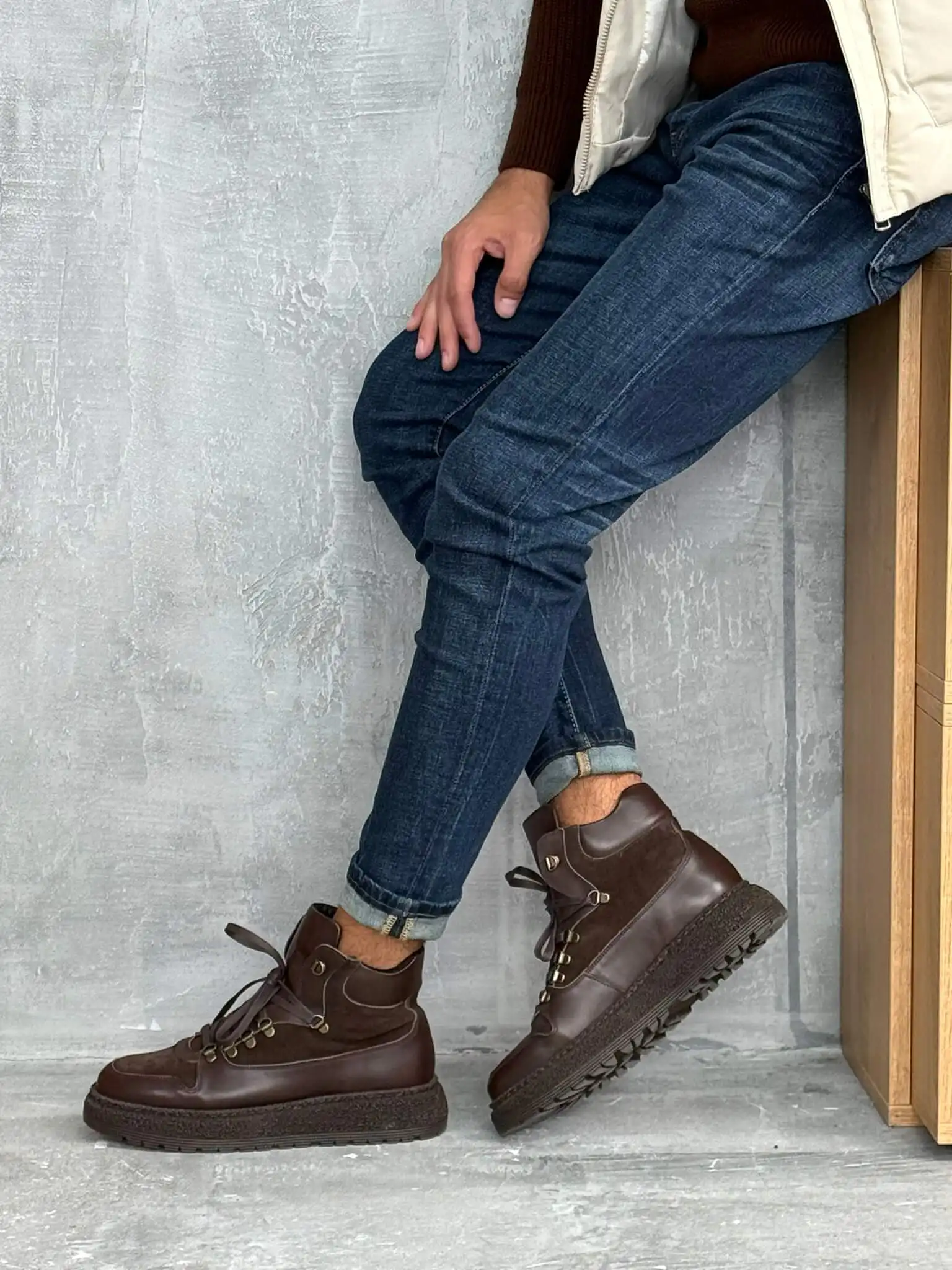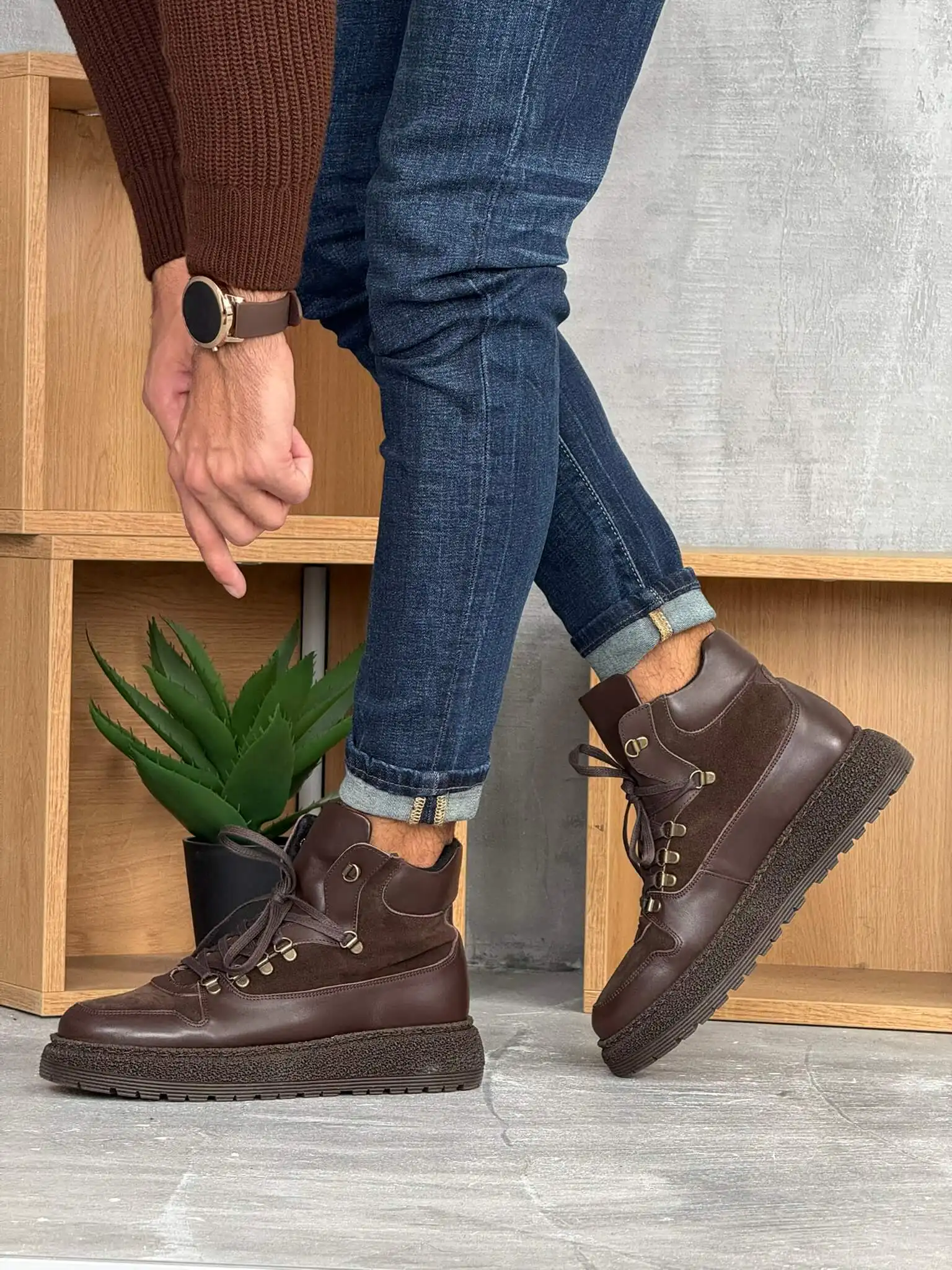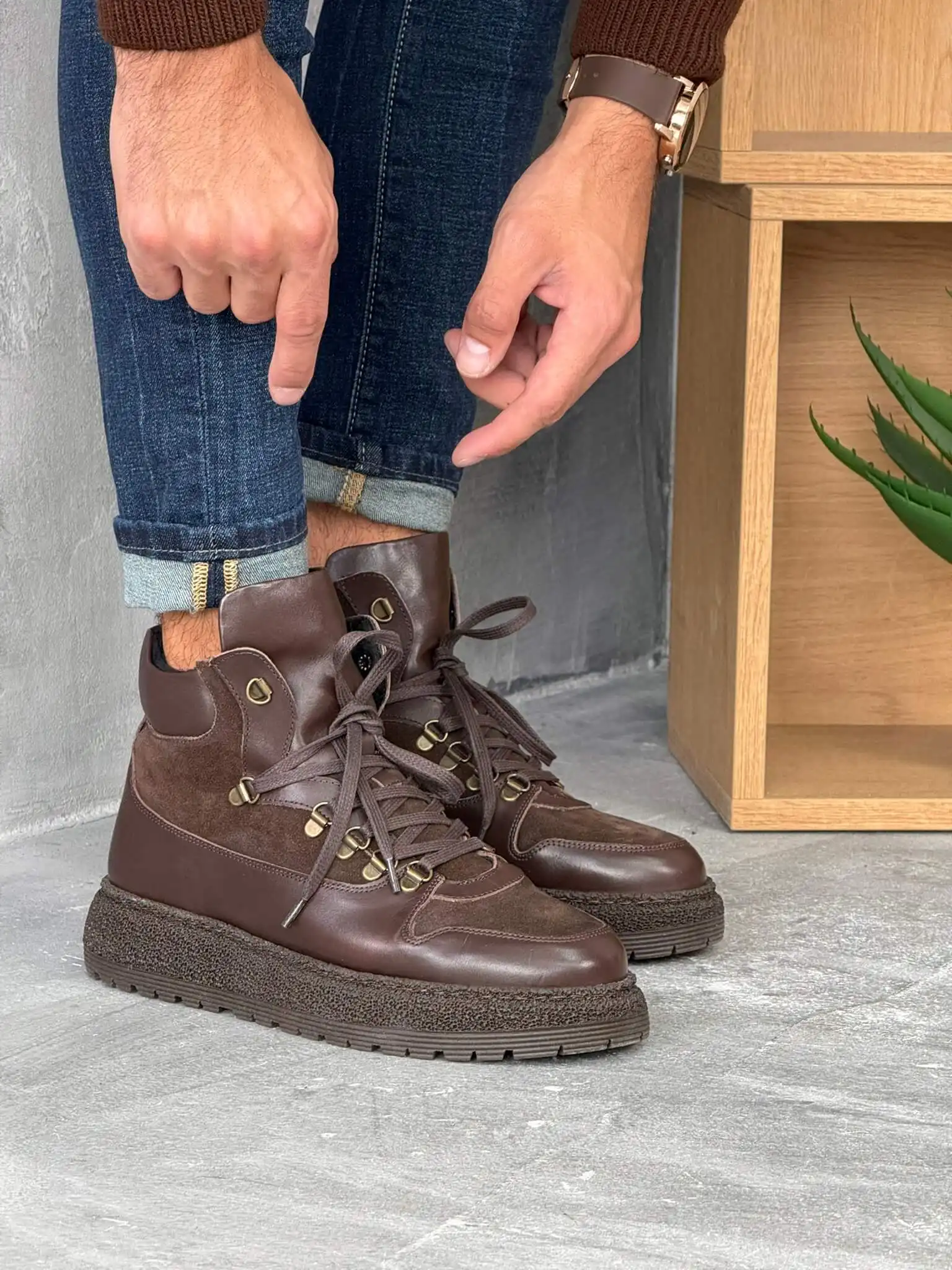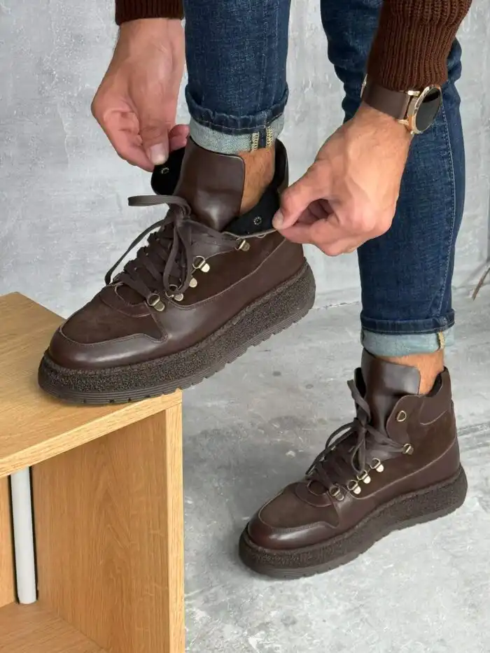 Elegantne muške čizme u tamno braon boji, izrađene od kombinacije glatke i brušene kože. Imaju čvrst đon sa izraženim šarama za bolju stabilnost i metalne kukice za pertle koje dodaju robustan, moderan izgled. Idealne su za jesen i zimu, pružaju udobnost i toplinu uz prefinjen stil.