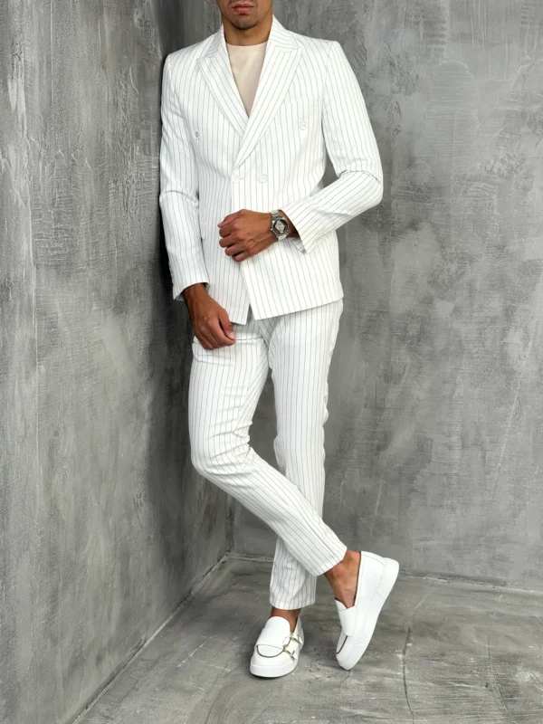 Belo prugasto sportsko-elegantno odelo sa duplim redom dugmadi savršen je spoj stila i udobnosti. Pantalone su krojene u slim fit stilu, sužene prema gležnjevima, a dužina im je do sredine gležnja, što daje modernu notu. Lagani materijal pruža udobnost, dok prugasti dezen dodaje dinamiku celokupnom izgledu. Idealno za prolećne i letnje prilike, ovo odelo se može kombinovati sa elegantnim cipelama ili patikama, u zavisnosti od željenog stila.