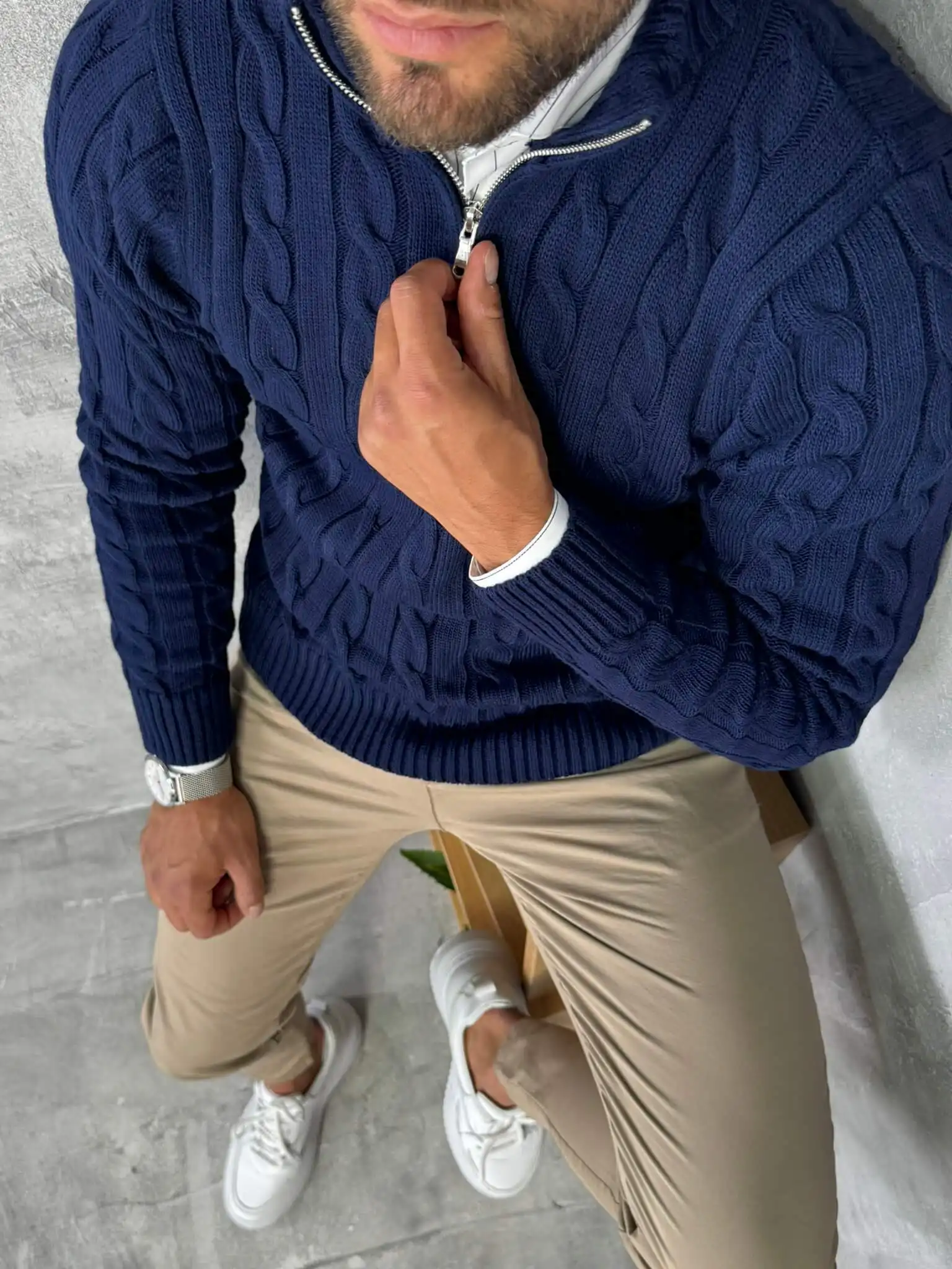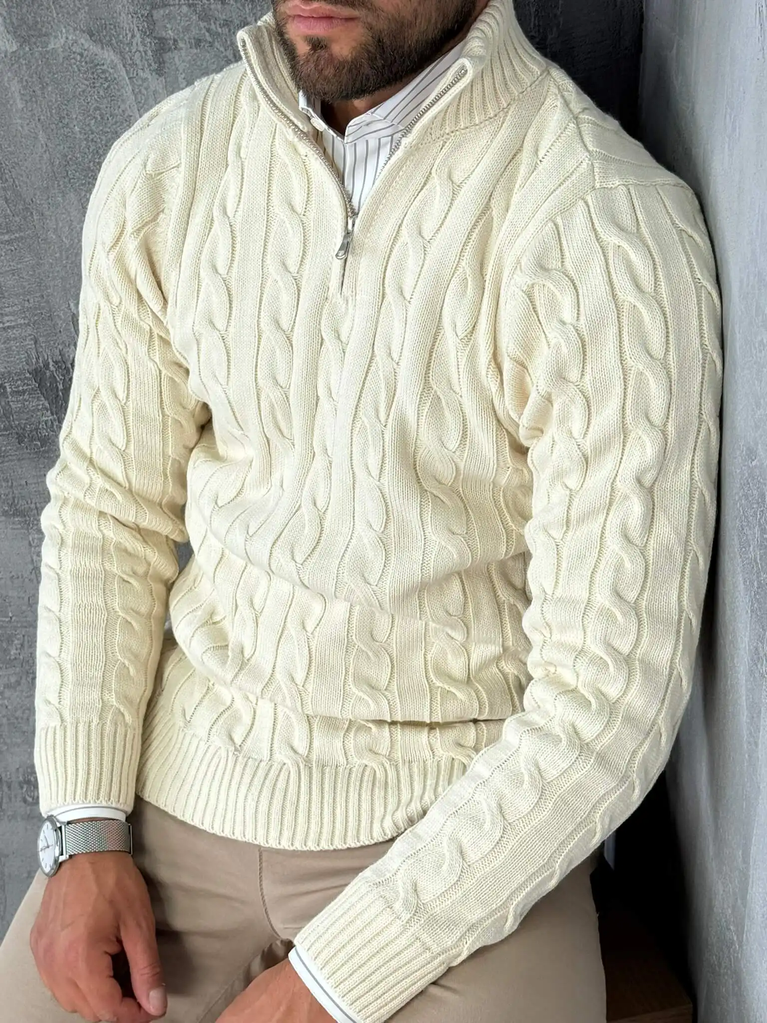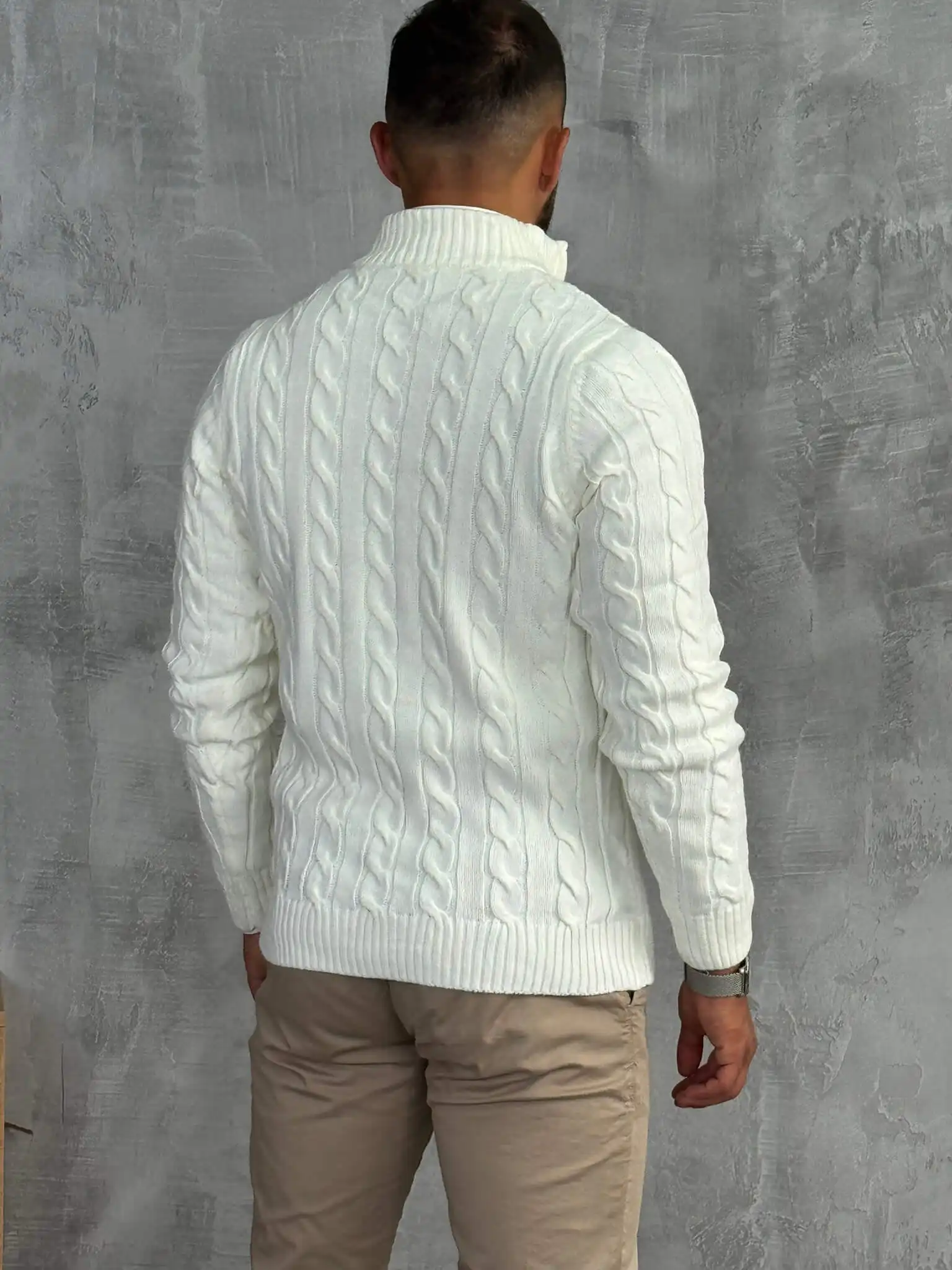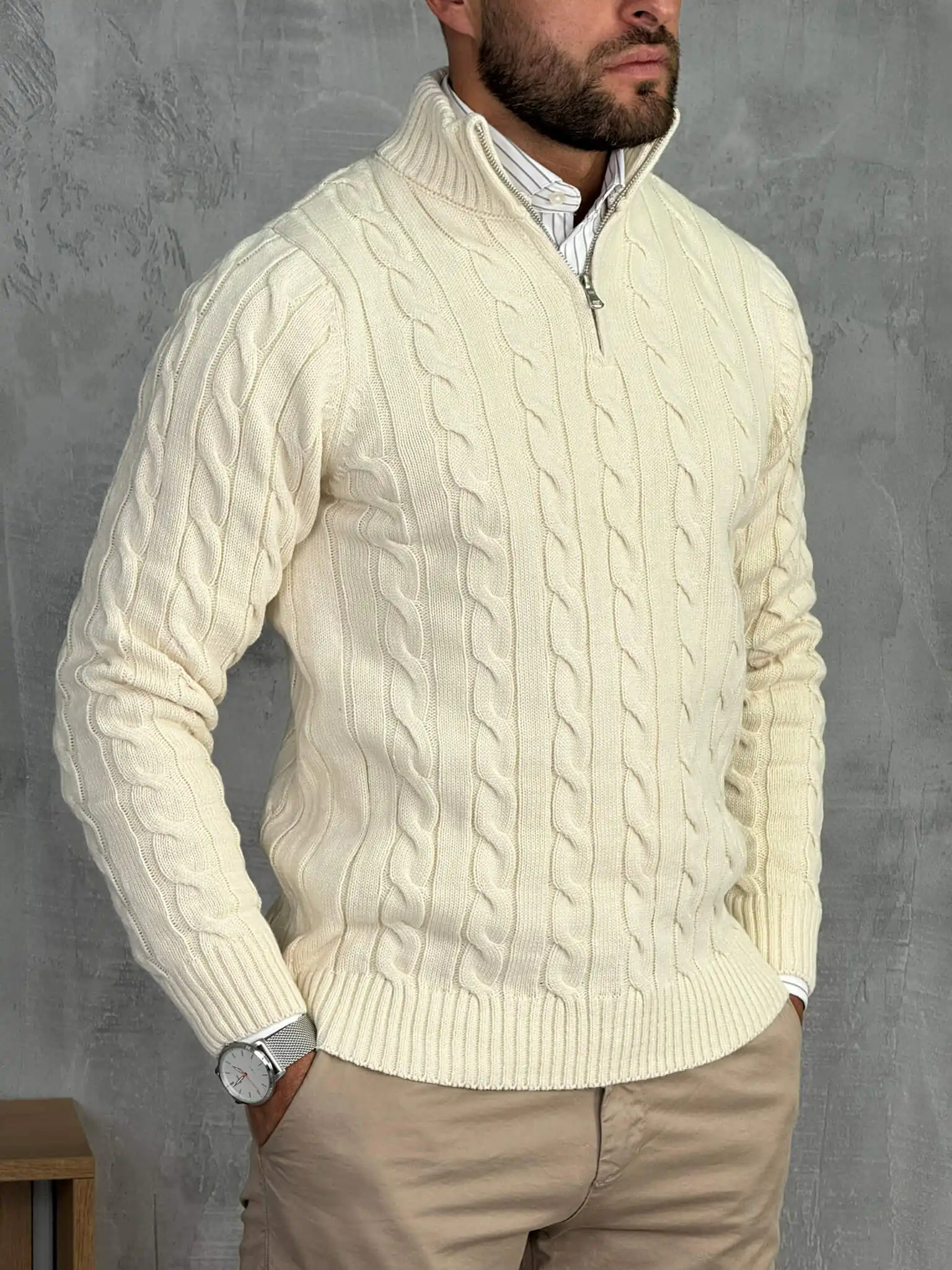 Ovaj polu-zip džemper izrađen je od debljeg, pletenog materijala sa prepoznatljivim cable-knit uzorkom koji daje bogat i moderan izgled. Topao je, mekan i pouzdan za hladnije dane, dok zip detalj omogućava da lako prilagodiš stil potpuno zakopčan za uredniji izgled ili otkopčan za ležerniji vibe.