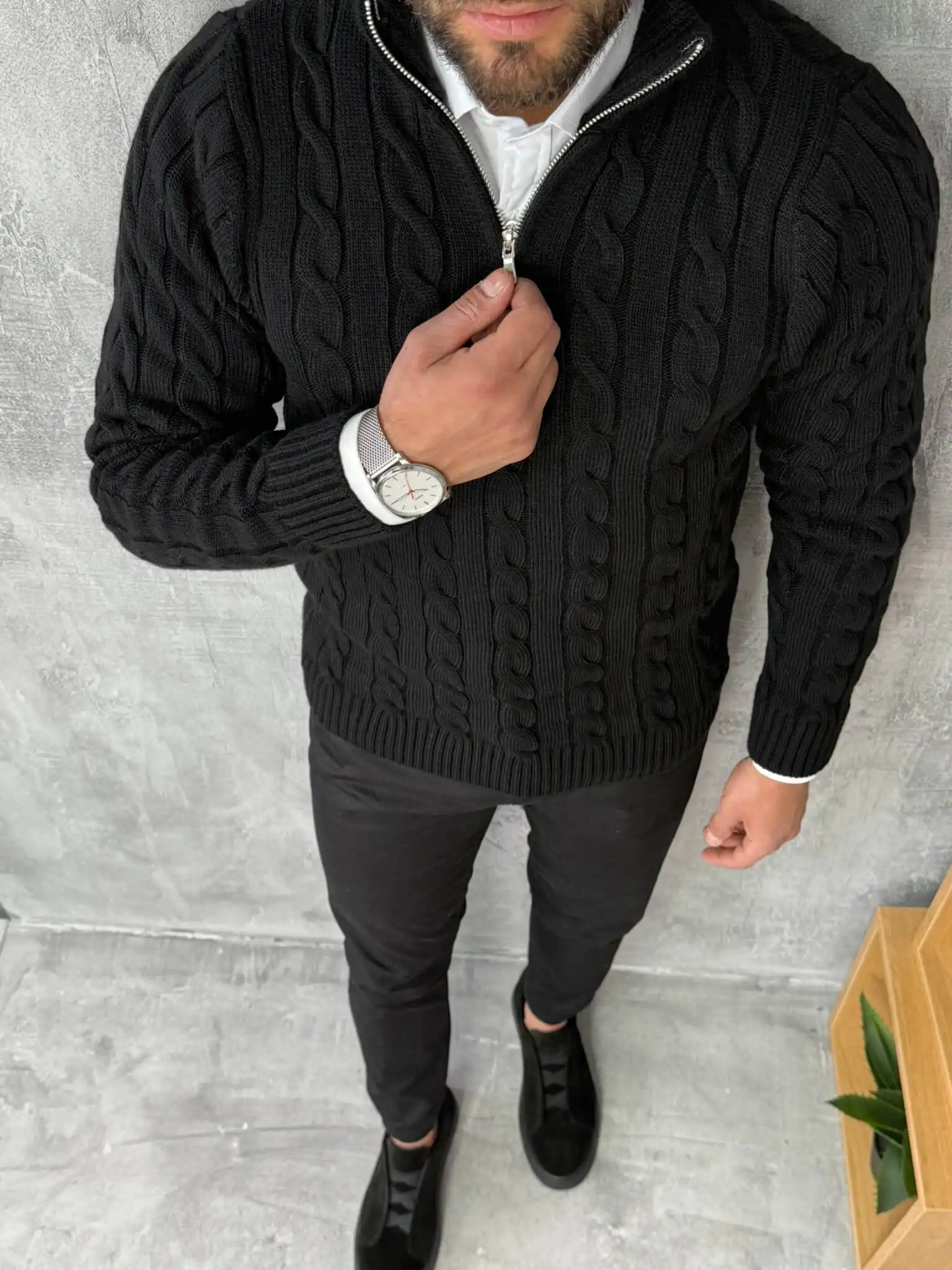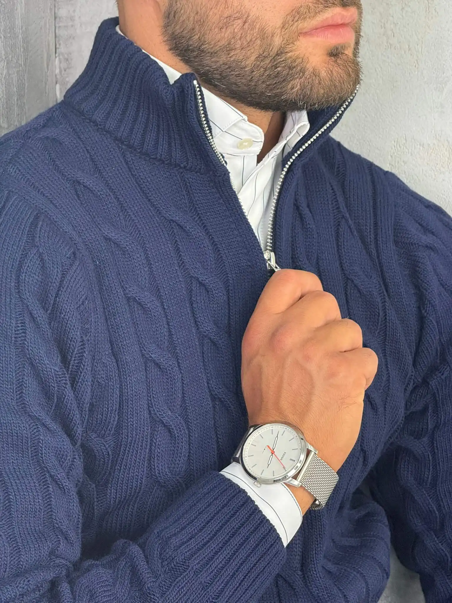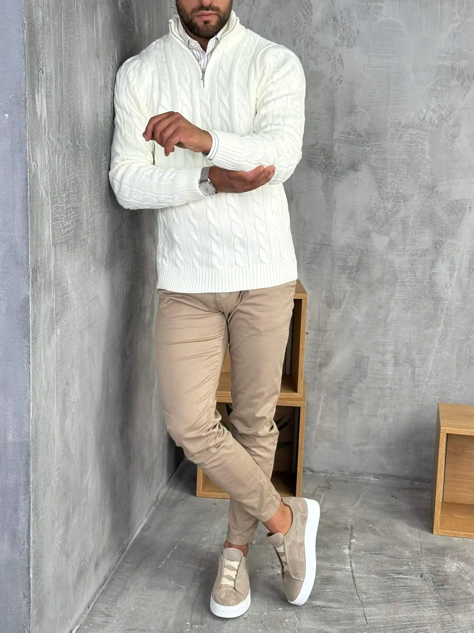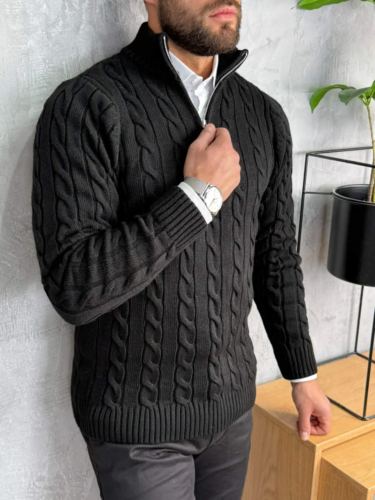 Ovaj polu-zip džemper izrađen je od debljeg, pletenog materijala sa prepoznatljivim cable-knit uzorkom koji daje bogat i moderan izgled. Topao je, mekan i pouzdan za hladnije dane, dok zip detalj omogućava da lako prilagodiš stil potpuno zakopčan za uredniji izgled ili otkopčan za ležerniji vibe.
